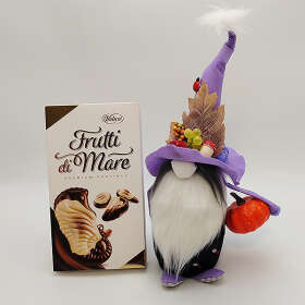 Pihe puha anyagból készült ruhájában, kezében fa szivecskével, szeretettel készült ez a csupaszív manófiúcska. Mellé egy doboz Lindor csokoládé.